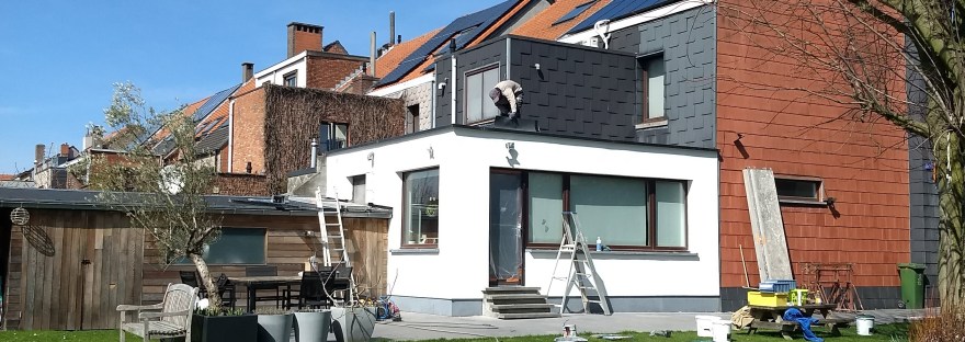 Heel handig om in de korte omgeving onze klanten te bezoeken. Ons devies is trouwens sowieso om rond de kerktoren te werken. De Fiat Ducato op de achtergrond is CNG-aangedreven. Wij geloven dat dit een milieuvriendelijke oplossing is voor korte verplaatsingen in de stedelijke omgeving. Onze vrachtwagen gebruiken we zo min mogelijk. Als het kan, blijft hij aan de werf staan.